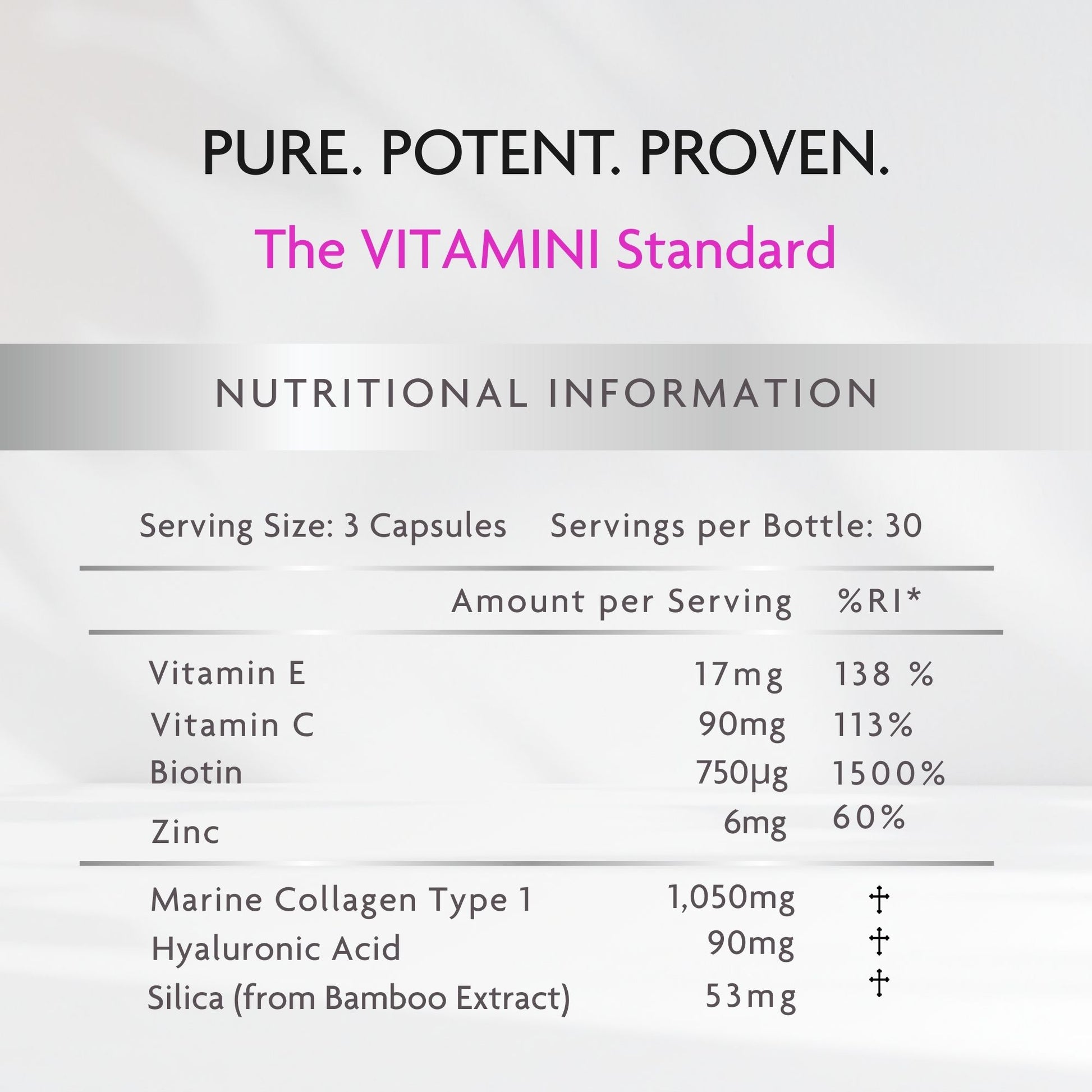 Silica (from Bamboo Extract, 53mg) – Naturally sourced silica promotes collagen formation, enhancing skin elasticity and strengthening hair and nails.